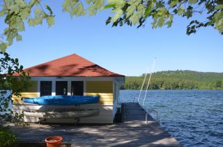 From an era of bygone grace 124 Alpine Park Road, Moultonborough, offers the opportunity to transcend time. A long, driveway that leads to the 2 homes on the property and offers complete privacy from the quiet road on which the property is located. Your first glance at the magnificent main house/cottage with great architectural "lines" adds to your sense of an era of grace! The lakeside porch has views over your large yard (a total of 2.33 acres).This 2.33 acre parcel, in an area of other estate Winnipesaukee waterfront parcels, is imbued with the peaceful feeling of nature! Classic Lake living is apparent in its every aspect! Classic Lake Cottage Design 5 Bedrooms Upstairs and Vaulted Living Room Downstairs There are five bedrooms in the upstairs of the main lake cottage. At 124 Alpine Park, Moultonborough's lake cottage you will find high ceilings, knotty pine walls, pine floors, and many windows for cross ventilation. These are some of the characteristics of summer cottages that still influence the design of contemporary lake homes today. The detached "barn" which has been converted to charming year round quarters for the current owners has additional sleeping quarters in its upper level. A kitchen and an open concept living area with a fireplace, now used for a woodstove, is on the entry level. The living area leads to a large den that opens to the laundry room and to a sun porch and deck. This converted barn has high ceilings and the original hardwood floors, which are in beautiful condition. The key elements of lake house warmth are yours in both the converted barn and classic lake cottage.  Also located on this Winnipesaukee estate parcel is a detached garage and bunkhouse. The lakefront near the distinctive boathouse, is perfectly level and perfectly, absolutely private! With 266 feet of prime Westerly facing shore front, and a lakeside lawn with ample room for outdoor recreation, this property will win your heart. Enjoy the westerly breezes from the wide docks along the side of the boathouse or from your porch. The gentle music from the Center-Harbor bandstand can be heard on Friday evenings from your docks as your own private sitting area! Enjoy the view of Gunstock Mountain on one side and the picture postcard view of the village of Center-Harbor on the other side.  Alpine Park's Swing on the Classic Lakeside Porch.